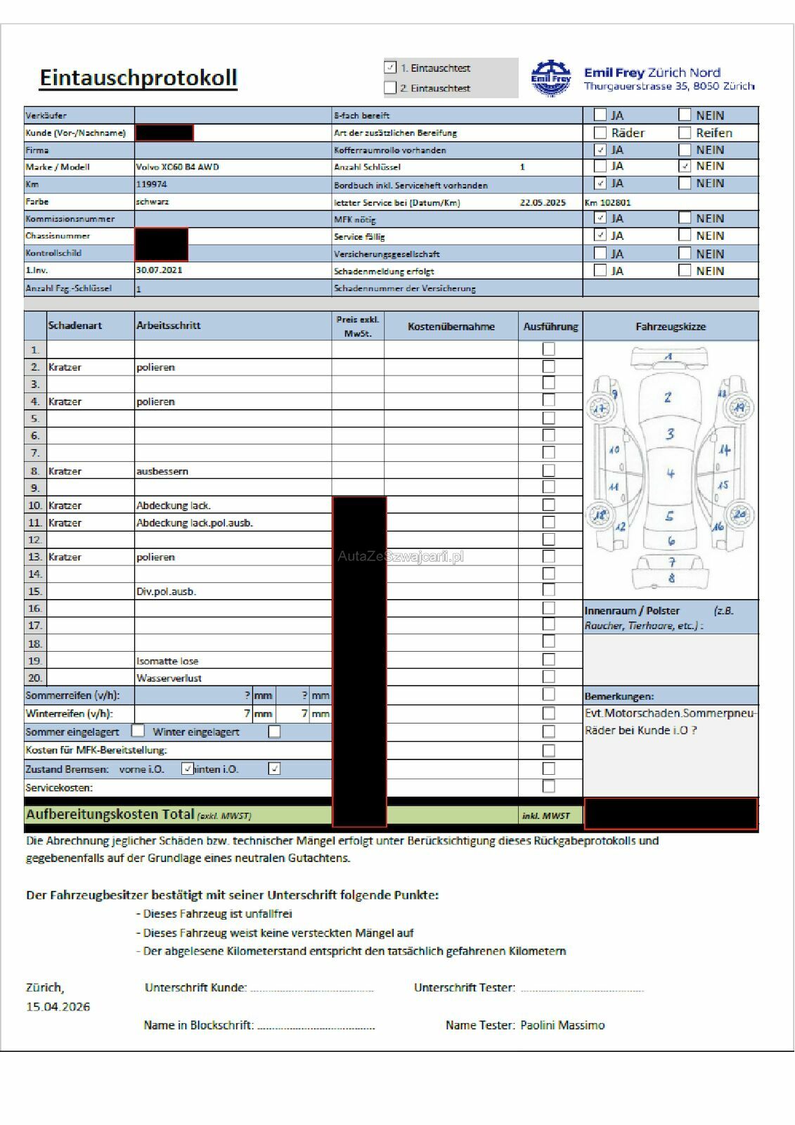 | Information | Keine technische Prüfung (Werkstatttest) vorgenommen Diverse Schäden an Karosserie/Lack. Fahrzeug ab Platz, ohne Garantie und Aufbereitung. Keine Gewähr auf die Angaben der Sonder- und Serienausstattung / keine mechanische Prüfung. Fahrzeug wurde unzerlegt expertisiert / keine Haftung für allfällige, nach Demontage bekanntwerdenden Mängel. Fahrzeugbereifung und Ausstattung gemäss Fotos / Fahrzeugkauf auf eigenes Risiko ab Platz ohne Nachwährschaft. WERKSTATT BEMERKUNG: Wir haben das gesamte Kühlsystem geprüft, abgedrückt, optisch geprüft und mittels diversen Probefahrten. Einen klaren Kühlwasserverlust können wir nicht feststellen, darum vermuten wir, dass der Zylinderkopf einen Schaden, einen Riss, hat. GARANTIE ANTRAG ERSTELLT ! - Kratzer auf der motorhaube / polieren - Kratzer auf dem Dach / polieren - Kratzer auf der Stosstange Hinten / polieren - Kratzer Türe VL / lackieren, polieren - Kratzer Türe HL / lackieren, polieren - Gesamtes Fahrezug muss poliert werden - Isomatte lose -Wasserferlust |