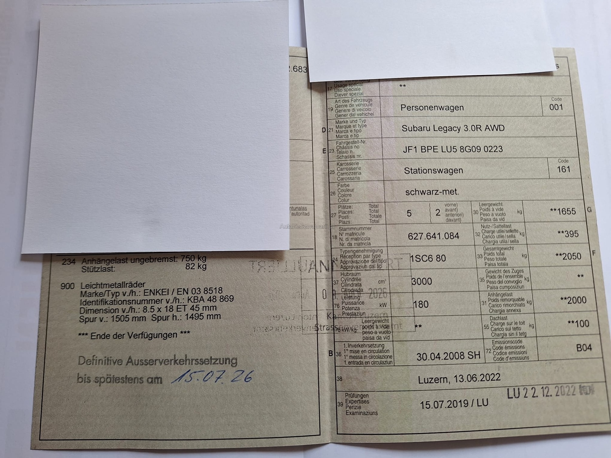| Kommentar | Legacy 3.0R AWD Executive AT, 8-fach Alu, Standheizung & AHK Im Kundenauftrag: Verkaufe Occ. Legacy 3.0R AWD Executive Automatic für Bastler oder Export Mit Standheizung und abnehmbar Anhängerkupplung, 2000kg Anhängelast Mit 18" Sommerräder Enkei, im Ausweis eingetragen (Reifen abgelaufen) 17" Subaru Winterfelgen, Reifen 5-6mm Bekannte Mängel: MFK und Service fällig Fahrersitz angerissen Antriebswellenmanschette vorne rechts defekt Lambdasonde defekt, MKL kommt zeitweise Simmerring Antriebswelle hinten rechts undicht Diverse Anrostungen, Beulen und Kratzer Ab Platz ohne Garantie Beschreibung stammt vom Kunden, wir haben das Fahrzeug nicht auf weitere Mängel geprüft. |
