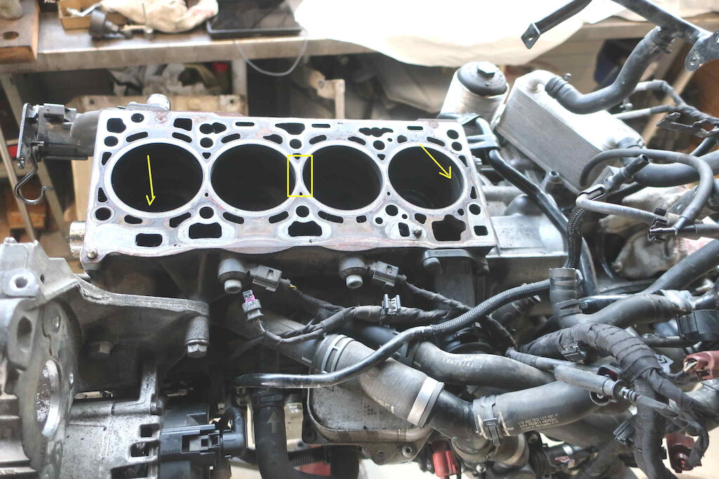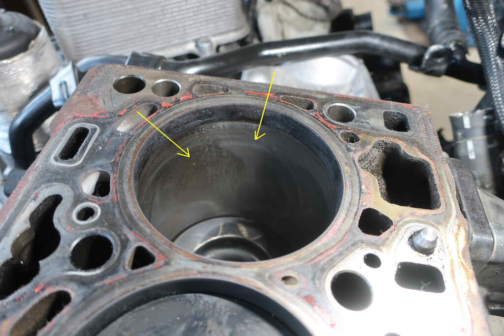 kCulasse déformée, bloc moteur, chemises rayées, suite à une surchauffe par manque d'eau.