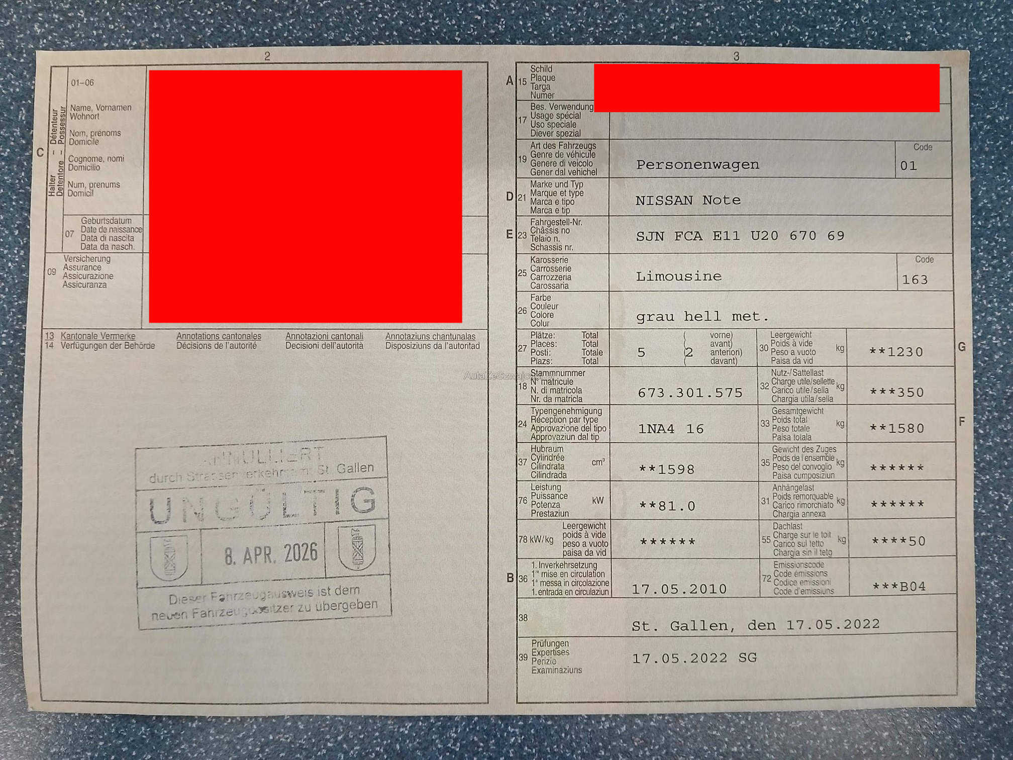 | Kommentar | - Airbaglampe blinkt, da das Lenkrad aus einem anderen Fahrzeug eingebaut wurde - im Kundenauftrag zu verkaufen Es wurde keine technische oder mechanische Prüfung durchgeführt. Fahrzeugkauf auf eigenes Risiko, ab Platz ohne Garantie und Nachwährschaft. Die Gewährleistung für Sachmängel wird wegbedungen. Wandelung und Minderung sind ausgeschlossen! |
