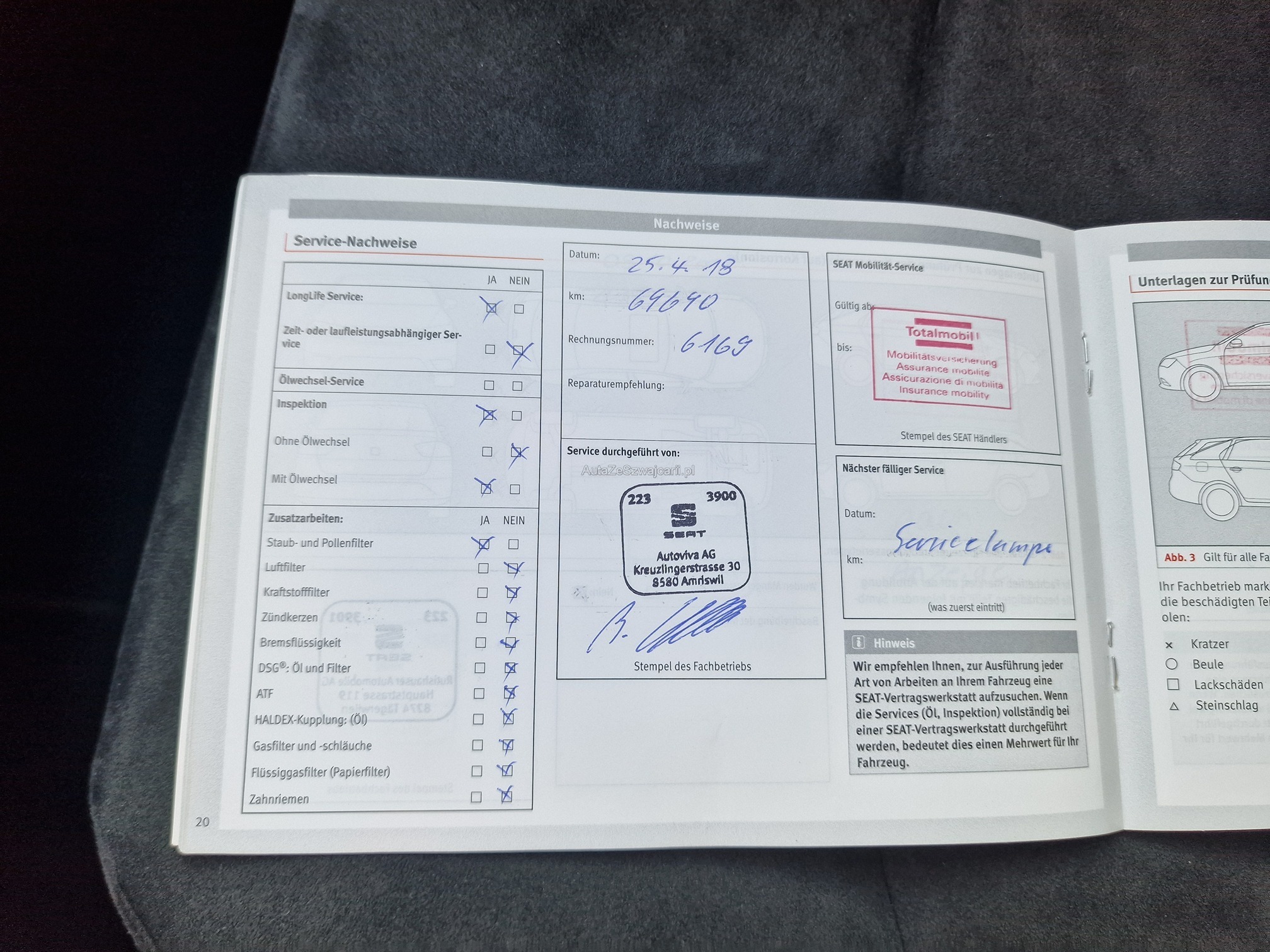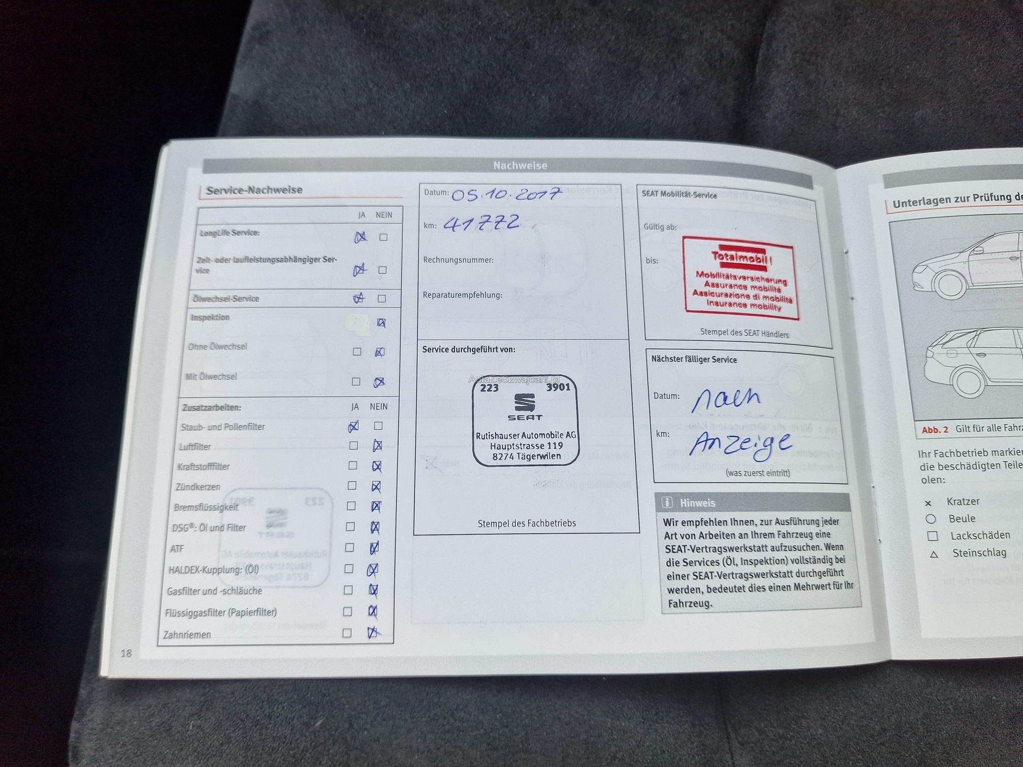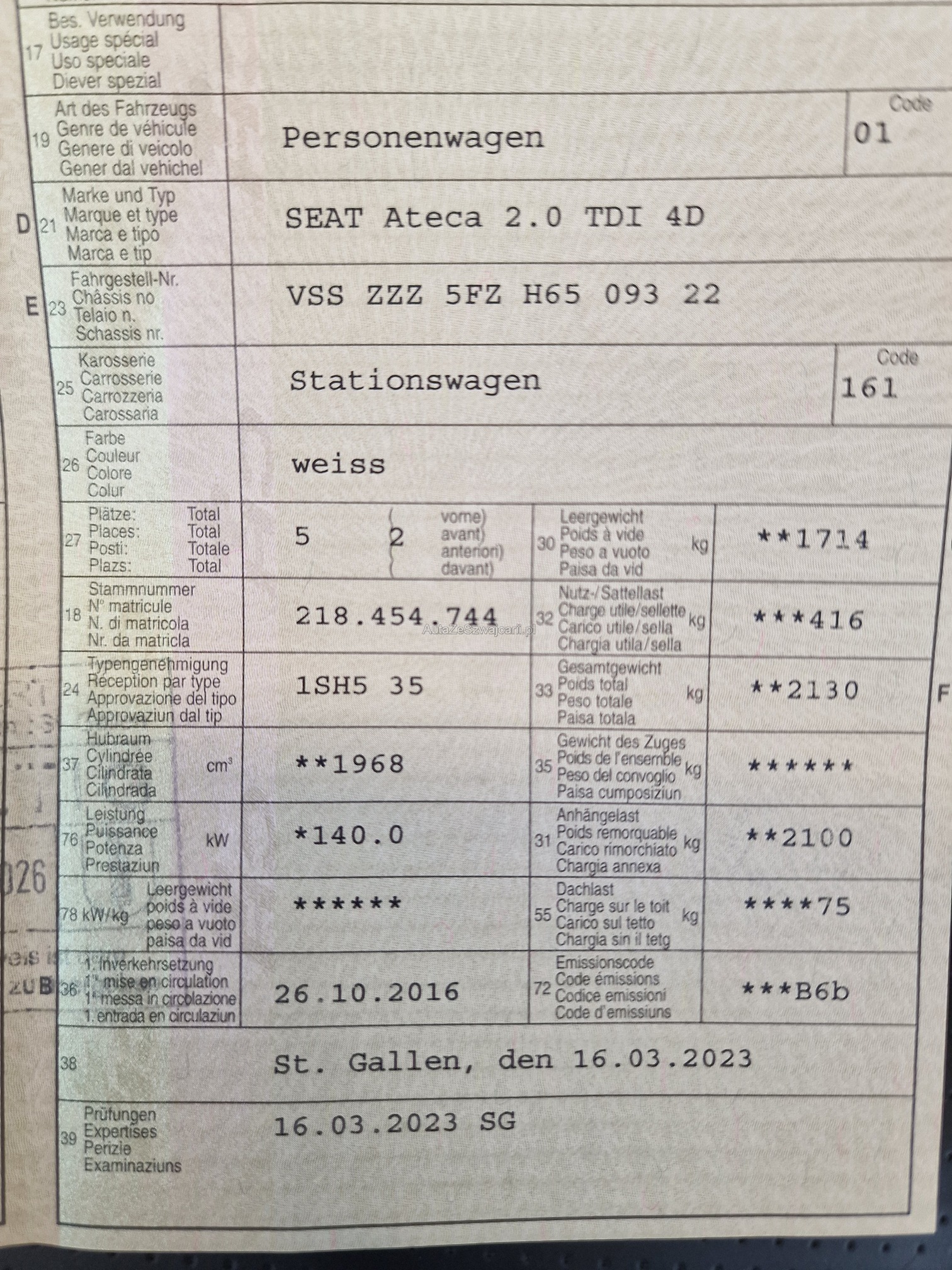 | Kommentar | - Aussen und Innen Gebrauchsspuren gemäss Fotos (Steinschlag Frontscheibe, Flugrost, Kratzer, Gitter vorne) - Fahrzeug noch im Kundenbesitz - Kein Eintauschtest / Diagnose durchgeführt - keine Nachverhandlung und / oder Nachwährschaft |