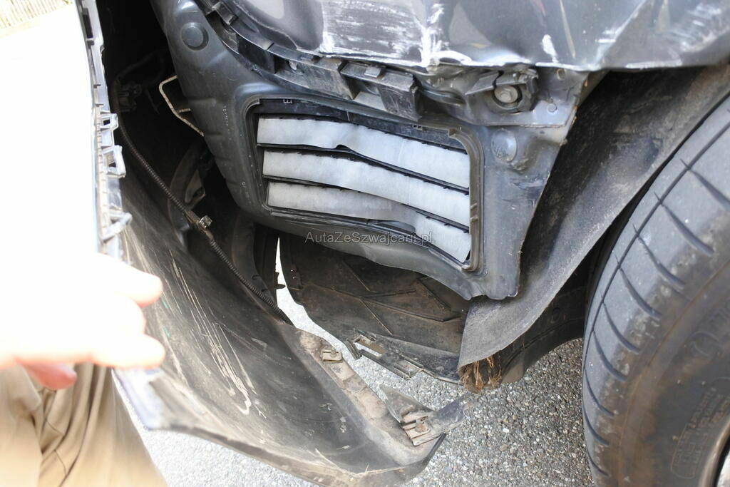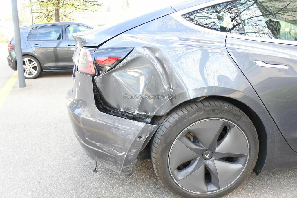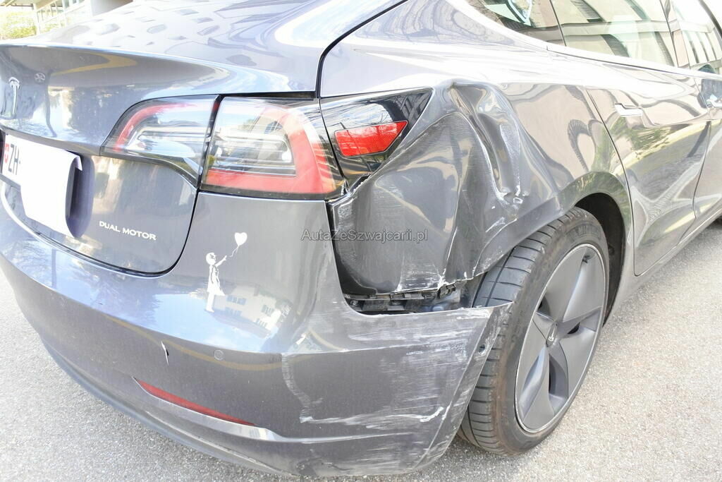 Die Stossstange mit Sensor und Befestigung, die Rückleuchten, die Seitenwand, das Radhaus und das Heckblech sind eingedrückt. Die Radaufhängung hinten rechts ist verformt.