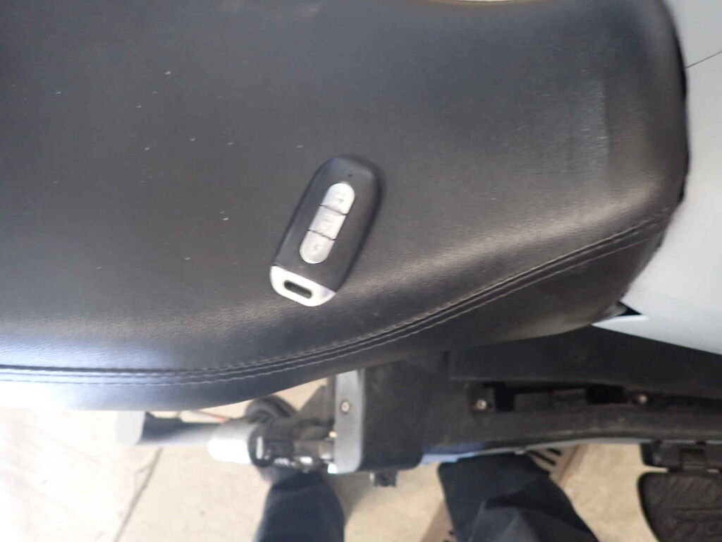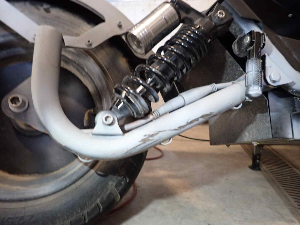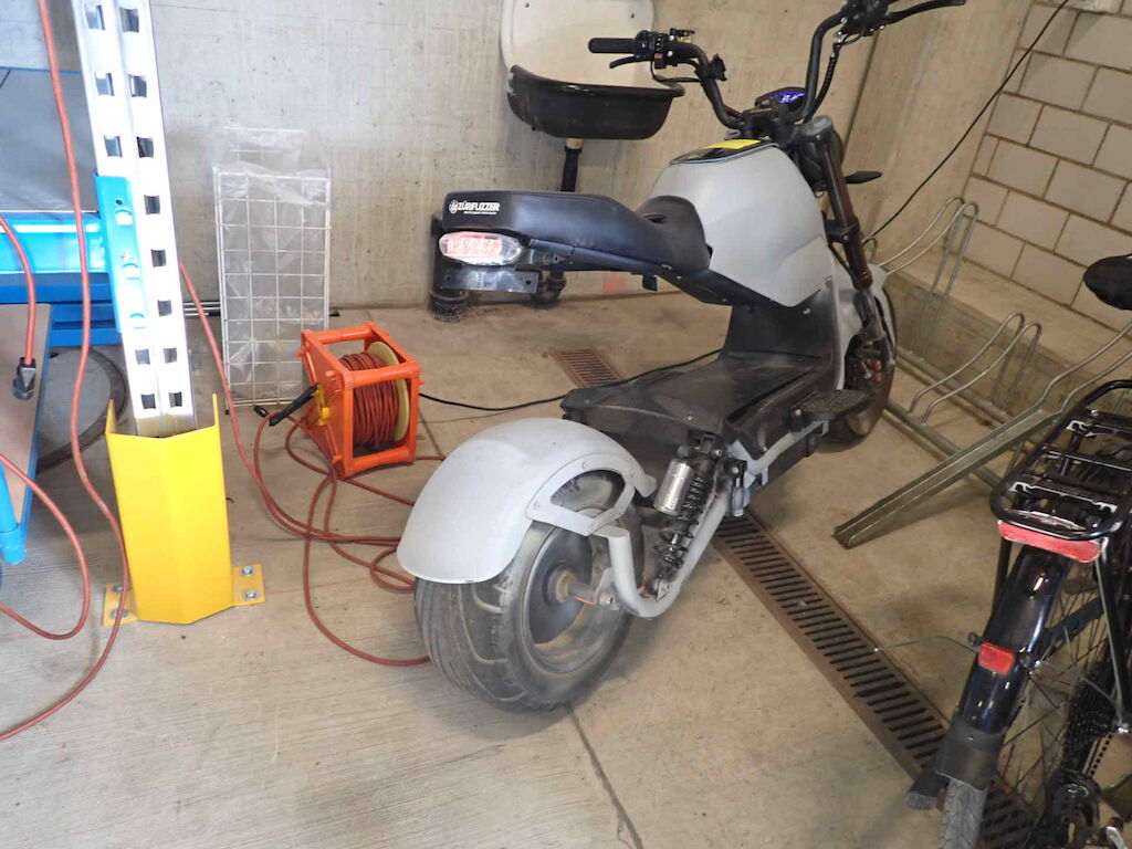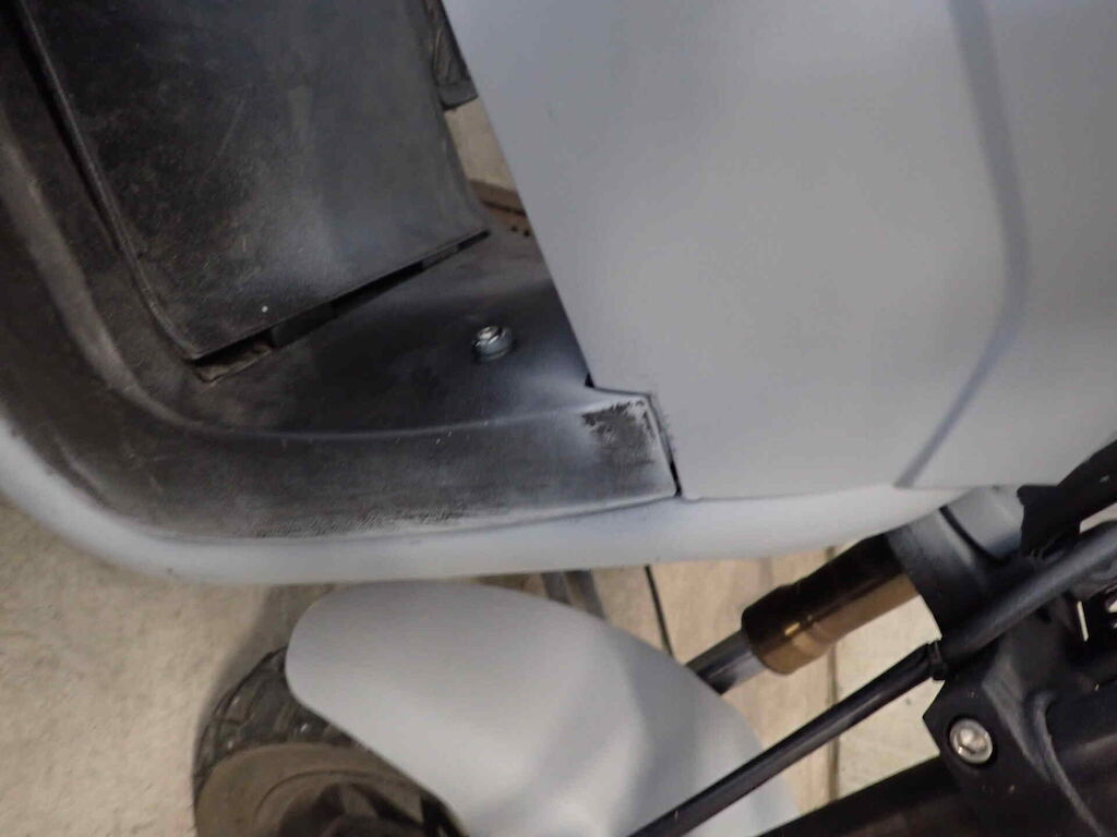Einbruchspuren an den Schlösser Zündschloss, Handschuhfach und Batteriekasten. Die Schwinge HR weist einen Lackschaden auf. Der gesamte roller wurde in sehr schlechte Qualität auf grau umlackiert