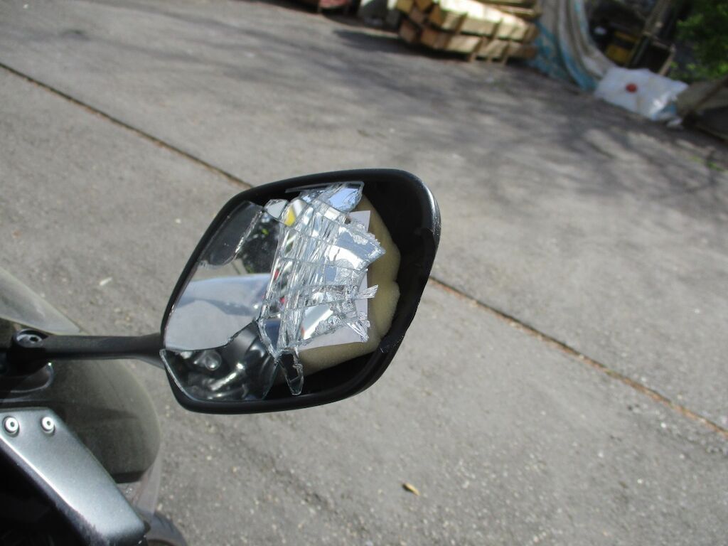 Das MR kam auf die rechte Seite zu liegen. Die Verschalungen vorne und hinten sind gebrochen. Der Benzintank ist eingedrückt. Der Motordeckel R und der Auspuff sind angeschürft. Der Lenkerstummel R , die Bremsanlage Vorne und die Fussraster R sind beschädigt. Der Lenkanschlag hat einen starken Schal erlitten, ist aber noch fix.