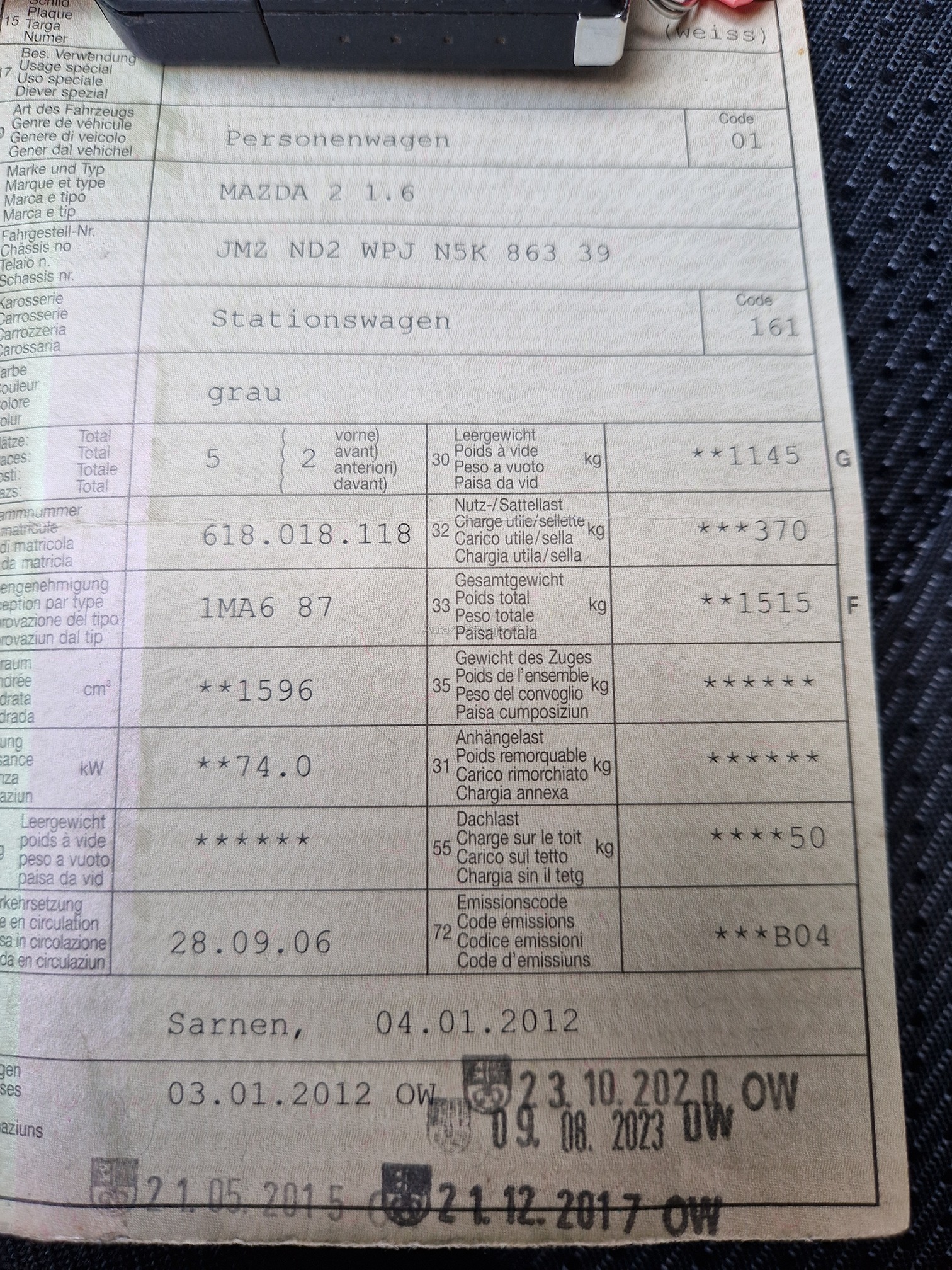 | Kommentar | Mazda 2 aus 1.Hand Sehr gepflegter Zustand Leichter Rost an Radläufen hinten und an Türe vorne links innen am Falz siehe Fotos Leichte Kratzer vorhanden Verkauf ab Platz ohne Garantie und Gewährleistung. Nach Gebotsabgabe wird nicht mehr verhandelt. Kann Besichtig werden Abholung innert 5 Arbeitstagen Sommer und Winterräder |
