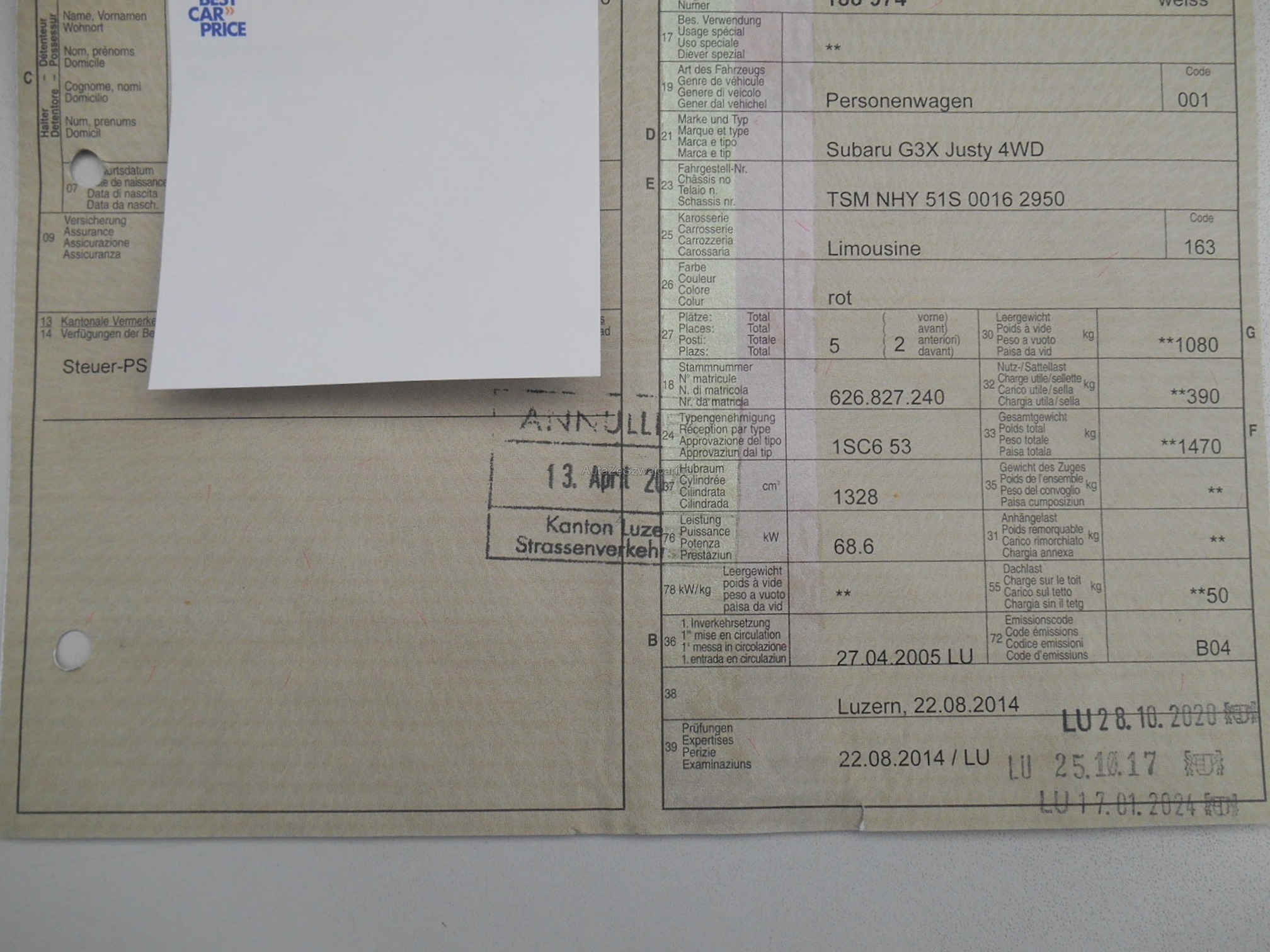 | Kommentar | Unfallschaden vorne / Zustand wie auf Bilder ersichtlich Fahrzeug ist fahrbar Am Fahrzeug wurde kein Werkstatttest gemacht. Für sichtbare und nicht sichtbare Mängel wird nicht gehaftet. Das Risiko liegt somit vollumfänglich beim Käufer. Jede Gewährleistung, soweit nach Gesetz möglich, wird wegbedungen, insbesondere sind Wandelung und Minderung ausgeschlossen. Keine Nachverhandlungen |