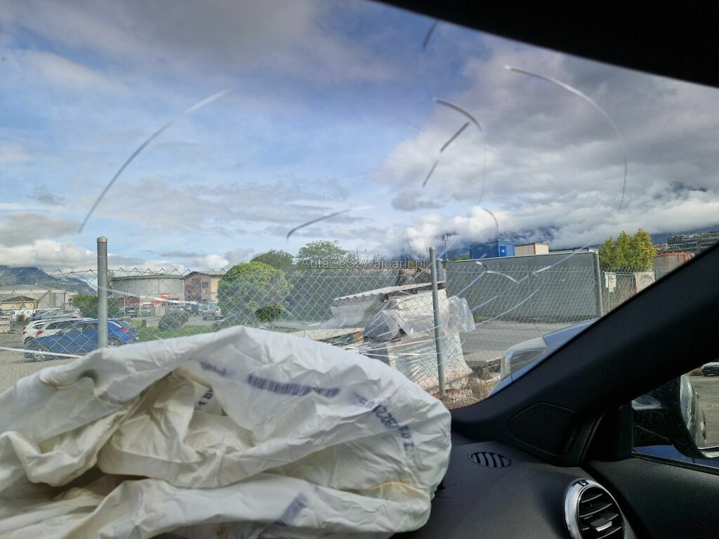 important choc: pare-choc avant, calandre, spoiler, phare gauche cassé, capot moteur enfoncé, aile avant gauche refoulée, mécanique avant gauche refoulée contre montant A , mécanique avant gauche à remplacer, direction à remplacer, joue d'aile gauche pliée, embout de longeron gauche plié, porte avant gauche marquée, aile avant droite pliée, jante et pneu avant droite endommagé, mécanique arrière gauche pliée, jante arrière droite pliée, pare-choc arrière arraché, air bag / passager activés, pare brise cassé, voir détail calcul dans le dossier