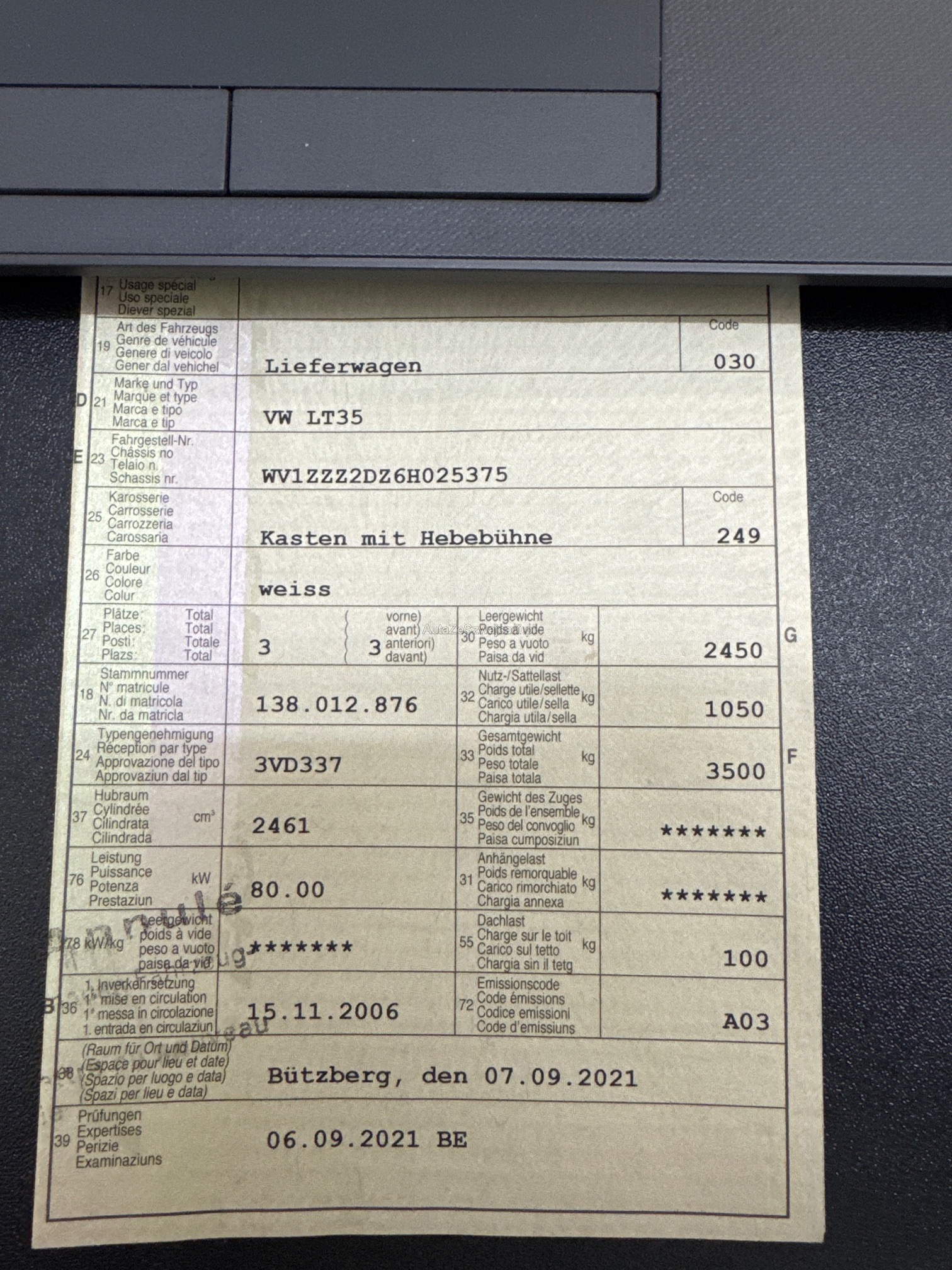 | Kommentar | - Zustand gemäss Bilder - Fährt und schaltet gut - Hebebühne funktioniert gut Zustand gemäss Fotos. Ab Platz ohne Garantie. Motor läuft. Am Fahrzeug wurde kein Werkstatttest gemacht (Für sichtbare oder nicht sichtbare Mängel wird nicht gehaftet). Wir testen & kontrollieren nicht alle Funktionen vom Fahrzeug. Das Risiko liegt somit vollumfänglich beim Käufer. Um Missverständnisse zu vermeiden kann das Fahrzeug auf Voranmeldung besichtigt & getestet werden, sollten Sie davon bewusst kein Gebrauch machen dann liegt die Verantwortung bei Ihnen. Nachdem der Höchstbietende den Zuschlag erhalten hat, gibt es keine Nachverhandlung, auch wenn nicht deklarierte Mängel zum Vorschein kommen sollten. Ab Platz ohne Garantie, Wandelung und Minderung werden wegbedungen |