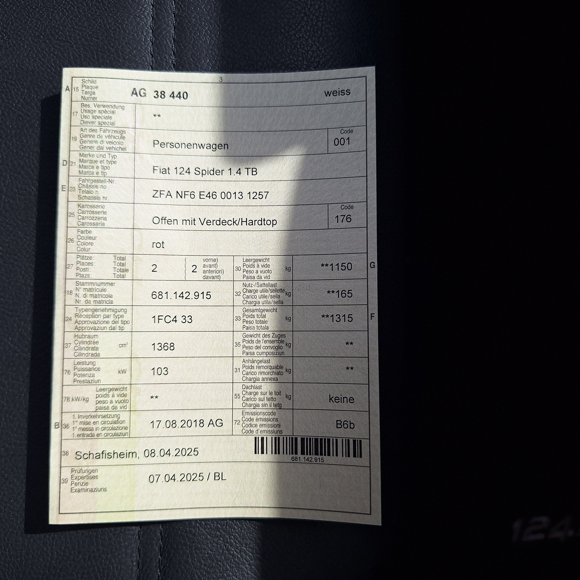 | Kommentar | Fiat 124 Spider Europa Limited Edition, Nummer 2 von insgesamt 12 Fahrzeugen in der Schweiz (Serie Anniversary Edition limitiert auf 124 Fahrzeuge weltweit). Das Fahrzeug befindet sich in Topzustand. Interieur: Leder schwarz. Inklusive Mopar-Heckträger und neuem Kofferset (siehe Beispiel-Foto). Nur Sommerbetrieb und sehr gepflegt. Der Fiat Spider erhielt beim Kauf vor einem Jahr einen umfassenden Service inkl. Wechsel Zahnriemen und neue Batterie. Er wurde seitdem nur 4’500 km gefahren. Der Spider ist jetzt frisch ab kleinem Service (Ölwechsel und Wechsel Ölfilter sowie allgemeine Kontrolle). Neue MFK auf Wunsch nach Vereinbarung. Beschreibung / Auszug aus der Pressemitteilung von Stellantis Schweiz: Das Fahrzeug ist eine Hommage an den klassischen Fiat 124 Spider, der vor genau 50 Jahren auf dem Turiner Automobilsalon 1966 präsentiert wurde. Aus Anlass des Marktstarts in der Heimat wurde eine auf exakt 124 Exemplare limitierte Sonderserie des neuen 124 Spider produziert. Die Sonderversion Fiat 124 Spider Anniversary ist an der markanten Karosseriefarbe Passione Rot zu erkennen. Das exklusive Sondermodell Fiat 124 Spider Anniversary basiert auf der Version Lusso, kennzeichnend ist darüber hinaus ein Ausstattungspaket mit adaptiven Hauptscheinwerfern in LED-Technologie sowie Licht- und Regensensor (Visibility Pack). Für aussergewöhnliches Musikvergnügen sorgt eine Audioanlage mit insgesamt neun Lautsprechern - davon vier integriert in die Kopfstützen (Bose Pack). Vervollständigt wird die Ausstattung des Sondermodells durch da schlüssellose Zugangssystem "Keyless Entry", Rückfahrkamera und Navigationssystem mit 3D-Darstellung (Premium Pack). Jedes Exemplar der Sonderserie Fiat 124 Spider Anniversary ist mit einer Seriennummer-Plakette sowie einem speziellen Fiat 124 Spider Logo im Kühlergrill versehen. Gewährleistung oder Garantie, Nachverhandlung und Rücknahme der Ware sind ausgeschlossen. |