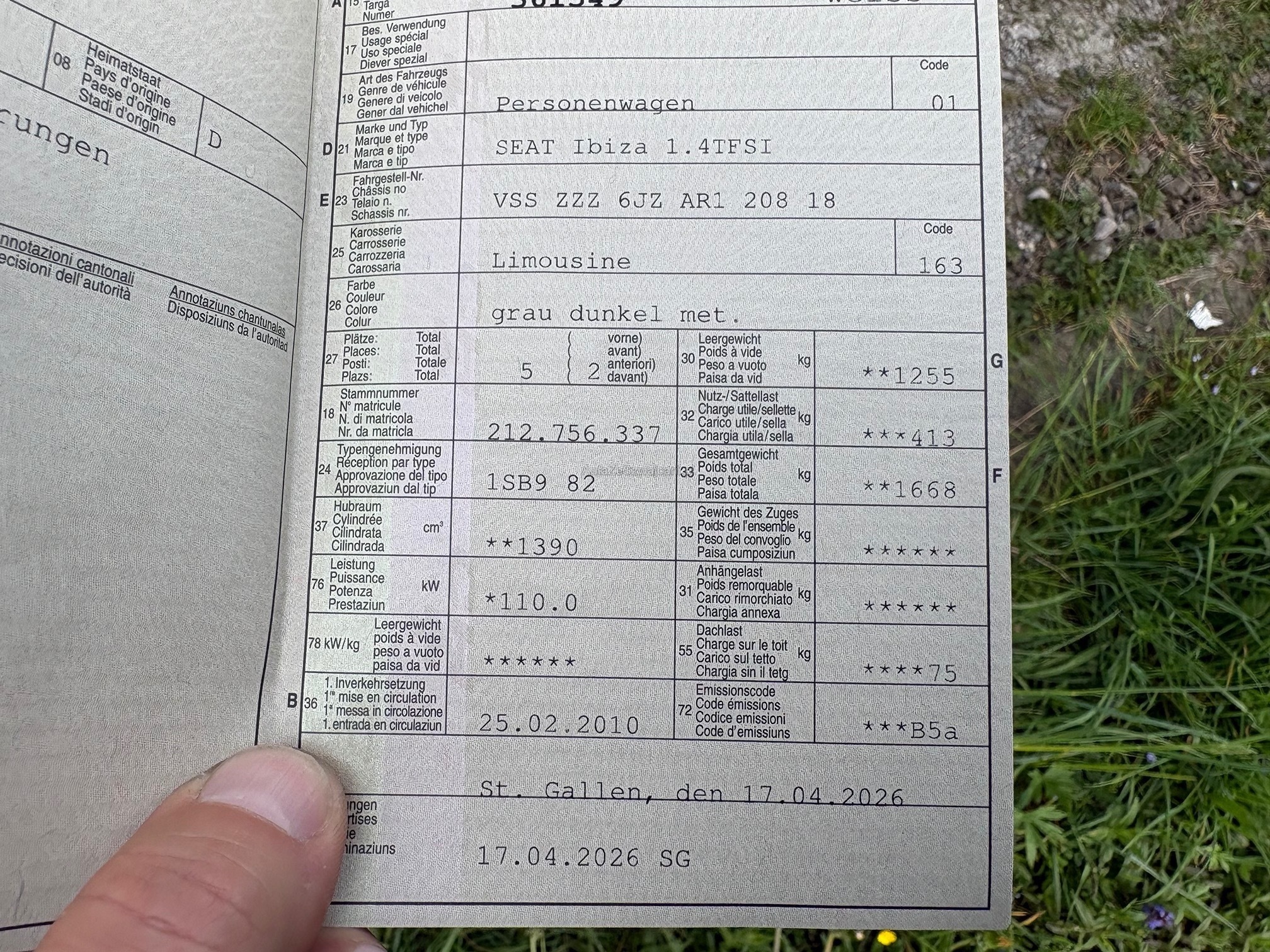 | Kommentar | FZ ab MFK 04.2026, Bremsen vorne ers. inkl. Bremszange VL, Endschalldämpfer ers. Wasserpumpe ers. Automat ruckelt mit leichten Geräuschen. Wurde Nicht geprüft! Ab Platz ohne Garantie und Gewährleistung! FZ muss innerhalb 3 Arbeitstage abgeholt werden. |