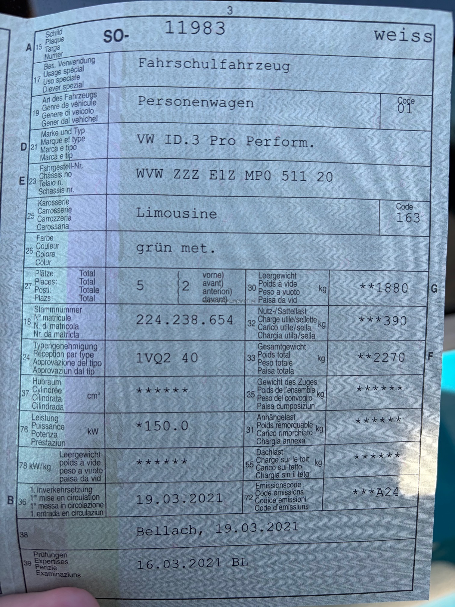 | Kommentar | Im Kundenauftrag zu verkaufen - ohne Gewähr VW ID.3 Pro Performance - mit Sommerreifen und AHK, Navigation, Rückfahrkamera uvm. Vorbereitung für Fahrschulauto (Pedalanlage Beifahrer ohne Pedale, siehe Foto), muss aber nicht für Fahrschule genutzt werden kleinere Gebrauchsspuren Carrosserie (siehe Fotos) SOS Knopf Aktion von VW - Lieferdatum unbekannt Allgemein sonst gepflegter Zustand. Im Kundenauftrag zu verkaufen, wir übernehmen keine Haftung. |
