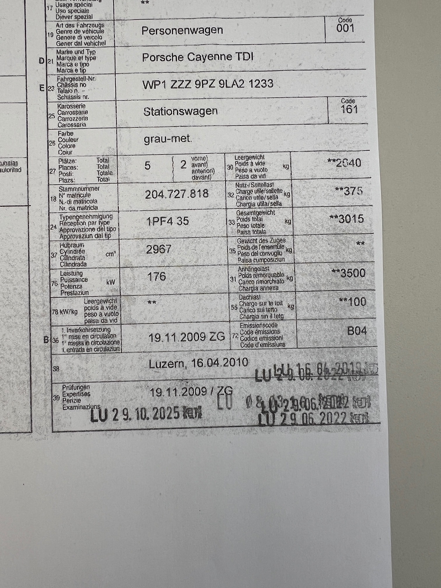 | Kommentar | Durch unsere Werkstatt wurde keine Diagnose gemacht und technisch nicht angeschaut. Nur vom Verkaufsteam für die Fotos. Fahrzeug wurde durch den Pannendienst zu Porsche Rotkreuz geliefert: Kunde von uns und nicht Porsche Rotkreuz. Gemäss Diagnose bzgl. dem Pannendienst durch Porsche Zentrum Rotkreuz: >Kühlwasser Verlust (Hat ein Leck) + Kühler muss ersetzt werden >Fehlermeldung AGR-Regler (ob das definitiv ersetzt werden muss, unklar) >Fehlermeldung Glühkerzen zum ersetzen (ob das definitiv ersetzt werden muss, unklar) >2te Schlüssel ob vorhanden, muss mit dem Kunden noch besprochen werden? sollte sicher vorhanden sein. >Fahrzeugmappe ob vorhanden, muss mit dem Kunden noch besprochen werden? War nicht im Fz. drin. sicherlich beim Kunden noch zu Hause. >Aktuell sind die Winterräder montiert und besitzt noch gebrauchte Sommerfelgen ohne Reifen, da die Reifen abgelaufen sind. Alle Aussen und Innenschäden gemäss Fotos vom 21.04.2026. Das Fahrzeug kann jederzeit in unserem Occasions-Center besichtigt werden (HORWERSTRASSE 120, 6010 KRIENS) Der Kunde hat schon ein Fahrzeug bei uns gekauft und möchte den best möglichen Preis gemäss Gebote. Hat keine genaue Preisvorstellungen und wir warten auf die Gebote von Best Car Price. Für weitere Fragen stehe ich Euch gerne jederzeit zur Verfügung: / gjergj.bullakaj@carplanet.ch |
