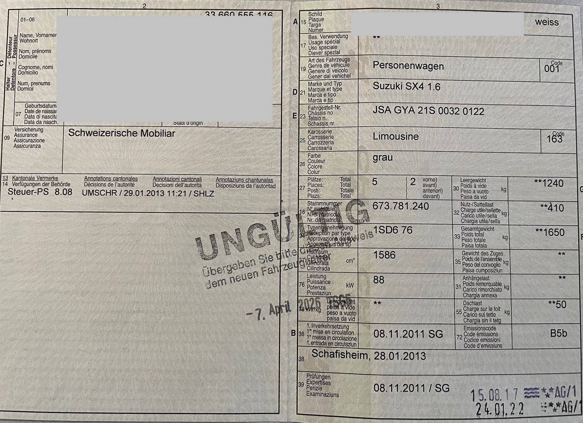 | Kommentar | Leichter Hagelschaden Verschiedene Karosserieschäden (siehe Bilder) Verschiedene Roststellen (siehe Bilder) Am Fahrzeug wurde keine vollumfängliche Prüfung der mechanischen Teile und der Carrosserie durchgeführt! Das Risiko liegt somit vollumfänglich beim Käufer. Um Missverständnisse zu vermeiden kann das Fahrzeug auf Voranmeldung besichtigt & getestet werden. Wird davon bewusst kein Gebrauch gemacht, liegt die Verantwortung beim Käufer. Nach Zuschlag, keine Nachverhandlungen möglich. Ab Platz ohne Garantie, Wandelung und Minderung werden wegbedungen. Abholung innert max. 5 Tagen. |