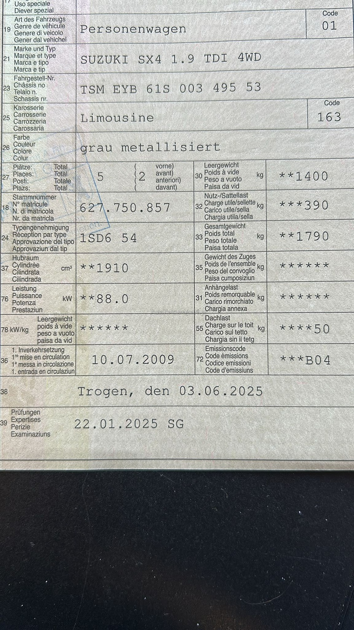 | Kommentar | ab Platz ohne jegliche Garantie, Innenraum fleckig, leichter Hagelschaden, Feder vorne rechts gebrochen, Service fällig, sporadische Motorstörung, nur Winterbereifung |
