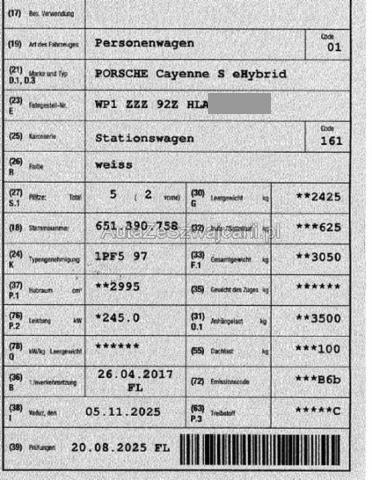 | Condition_and_Equipment | Zustand Fahrzeug hat sich mehrmals überschlagen. Schlüssel Nur ein Schlüssel vorhanden. --- Links Linke Seite beschädigt. Rechts Rechte Seite beschädigt. Front Fahrzeugvorbau verschoben. Heck Kofferboden eingedrückt. Längsträger hinten rechts gestaucht / abgeknickt. Achse Vorderachse ist beschädigt. Hinterachse ist beschädigt. Motoraufhängung/Aggregateträger ist beschädigt. Innenraum Beide Airbags sind ausgelöst. Kopfairbag links ausgelöst. Armaturenbrett ist beschädigt. Gurtstraffer ausgelöst. Dachhimmel gerissen. Glas Windschutzscheibe ist gerissen. Dach Dach eingedrückt. Unterboden Bodengruppe verzogen/beschädigt. --- Serienaustattung Airbag Fahrer und Beifahrerseite Elektrische Fensterheber vorne + hinten ABS Antiblockiersystem Servotronic Nebelscheinwerfer Zentralverriegelung mit Fernbedienung Sprachbedienungssystem Scheibenwischer mit Regensensor Reifendruck-Kontrollsystem RDK Aussenspiegel elektrisch verstellbar/ heizbar und anklappbar Alarmanlage mit Innenraumüberwachung Bi-Xenon-Scheinwerfer Sitzbezüge in Teilleder Einstiegsleisten Edelstahl Zwei Zonen-Klimaautomatik ESP/ ASR/ MSR Vorhangairbags Seitenairbags vorne Handy Vorbereitung Tempostat Multifunktions-Lederlenkrad 3-Speichen Active Suspension Management PASM Leichtmetallräder 18" Cayenne S Komfortsitze elektrisch vorn Rücksitze geteilt umklappbar 40/20/40 Heckklappe automatisches öffnen/ schliessen Anschluss USB/ AUX und iPod Universelle Schnittstelle Porsche Communication Management PCM LED Tagfahrlicht Keine Gewähr auf die Angaben der Serienausstattungen Sonderausstattung Luftfederung + Niveauregulierung Heizbare Frontscheibe Garagen-Toröffner HOME LINK Pack Exterieur schwarz Pack Sport Chrono Abstandsregeltempomat Anhängerkupplung elektrisch ausklappbar Multifunktionslenkrad Leder 3-Speichen/ Lenkradheizung Spurwechselassistent LED Rückleuchten abgedunkelt DAB+ Digital Audio Broadcast Tempolimitanzeige Park-Distanz-Sensor v+h/ Rückfahrkamera/ Surround View On-Board Lader |