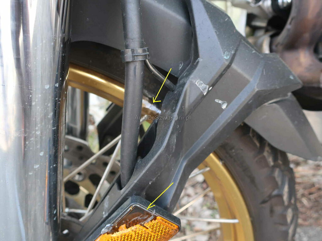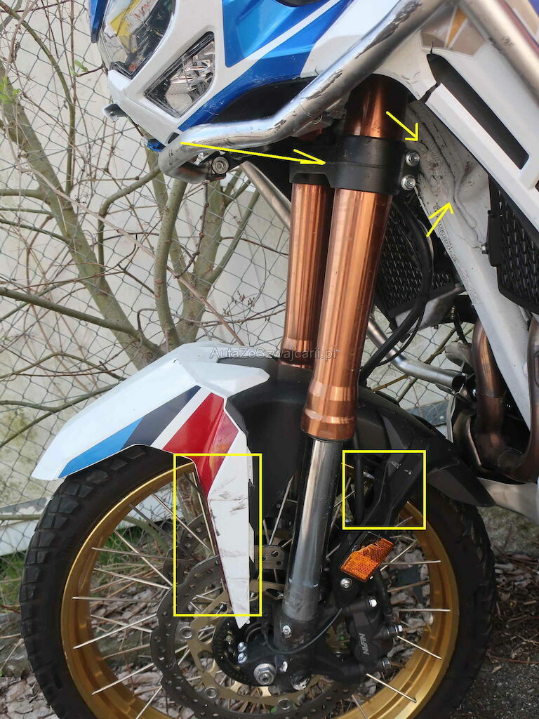 Roue avant, disque de frein, fourche avant, guidon, poignée, protège poignée, rétroviseur le tout à gauche, réservoir rayé, ponts de fourche, cadre, radiateur gauche, tête de fourche, carénage gauche.