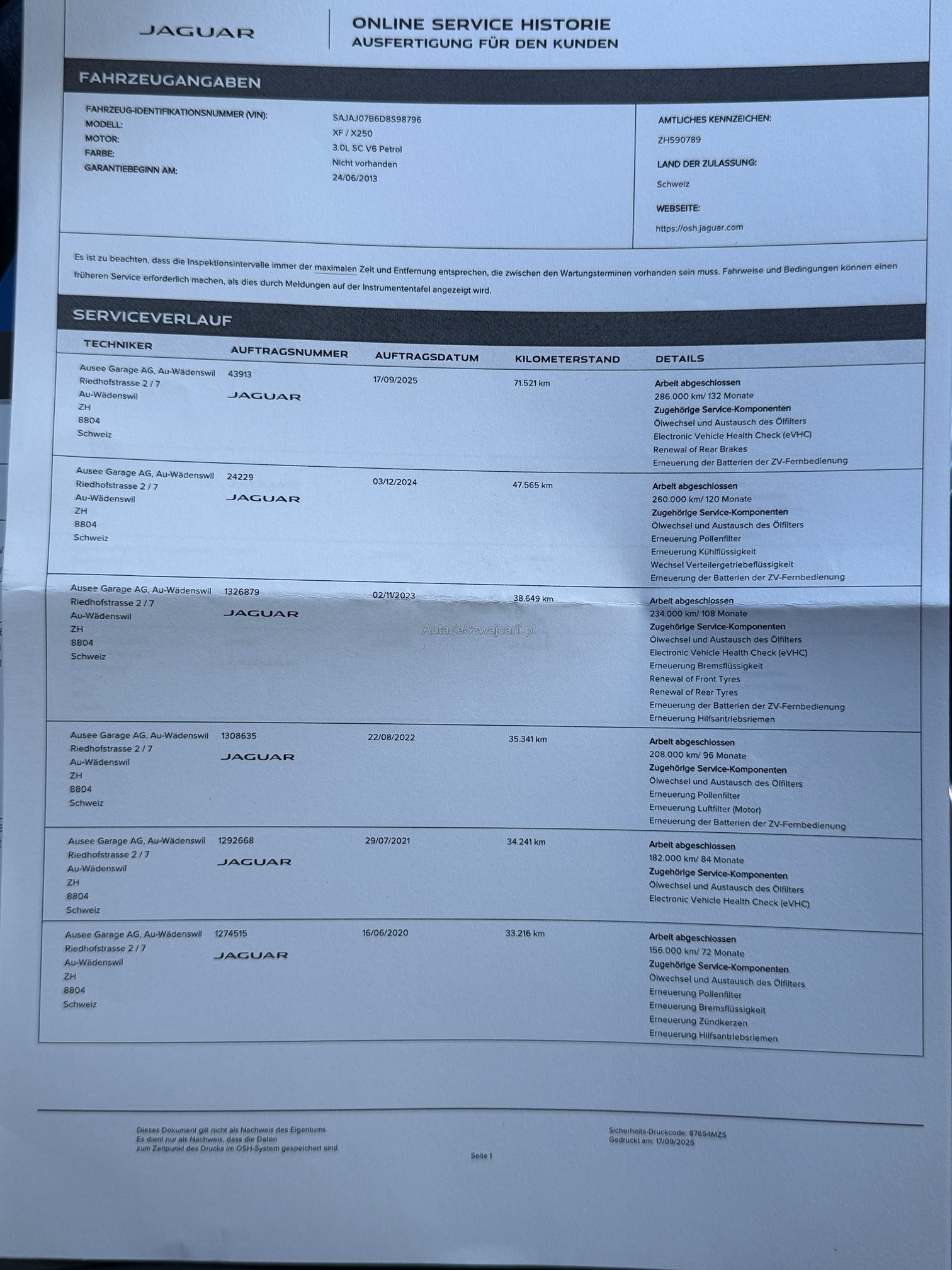| Kommentar | Fahrzeug fährt sich einwandfrei, es leuchten keinerlei Warnlampen oder sonstiges. Fahrzeug von älterem Herrn gefahren und immer sauber gewartet bei Jaguar. Mängel: 4 Felgen leicht verkratzt Dach hinterer Teil ca. 10 kleinere Dellen siehe Bilder Rest sauber. Beifahrertüre hinten leicht verkratzt siehe Bilder Fahrzeug ist bereits eingetauscht und wird nur abgegeben werden wenn wir einen Mindestreis von Fr. 6`000.- und mehr erzielen. Fahrzeug muss innert 3 Arbeitstagen Abgeholt werden. |