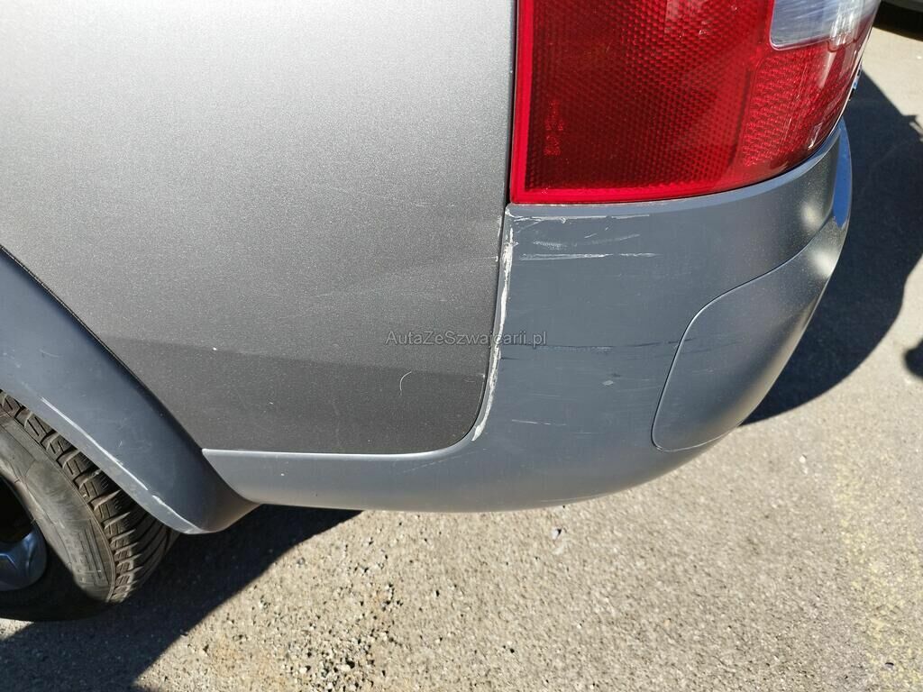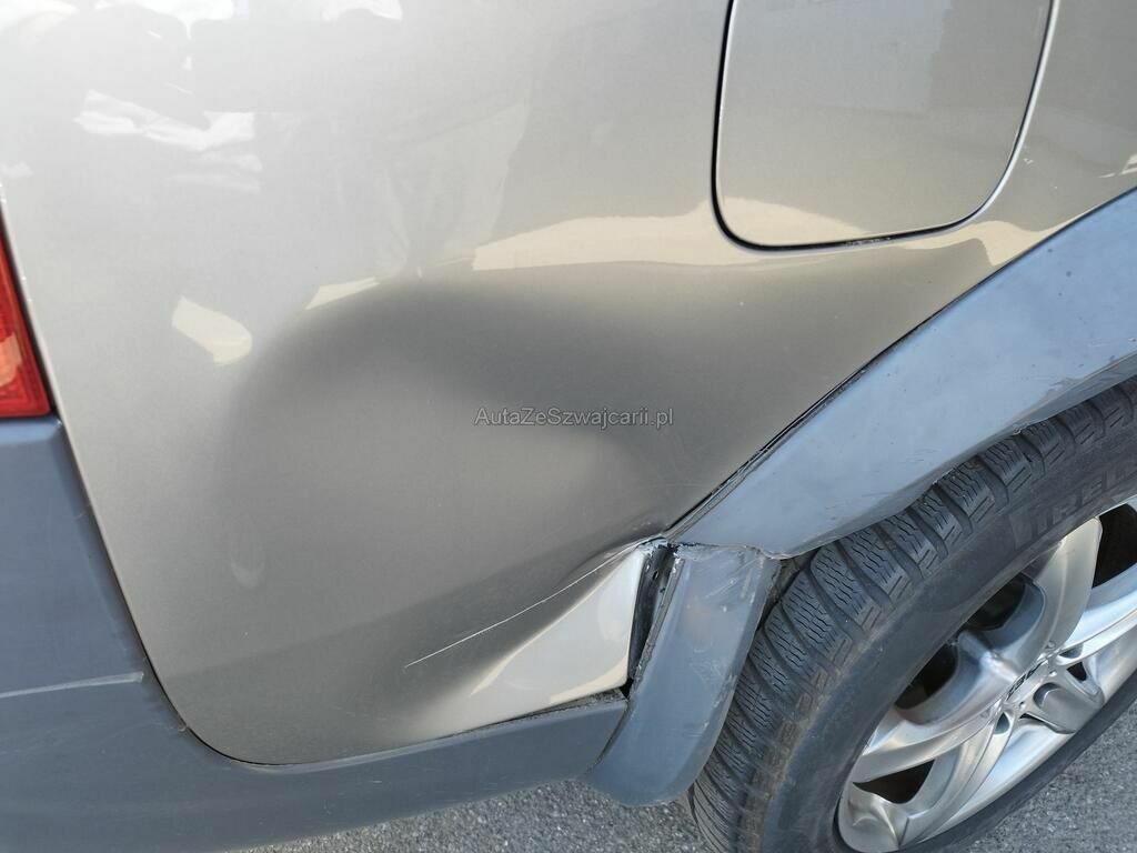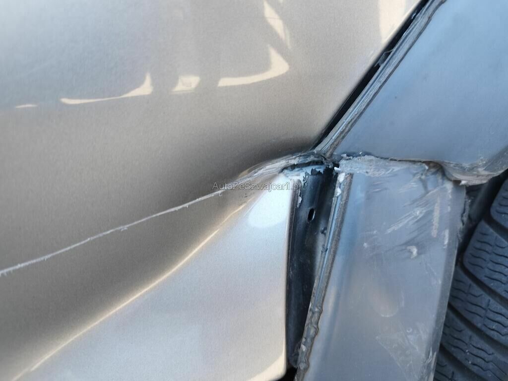 Die Seitenwand hinten rechts ist deformiert und aufgeschlitzt, der Radlauf hinten rechts ist gerissen, die Stossstange hinten rechts hat Kratzspuren.