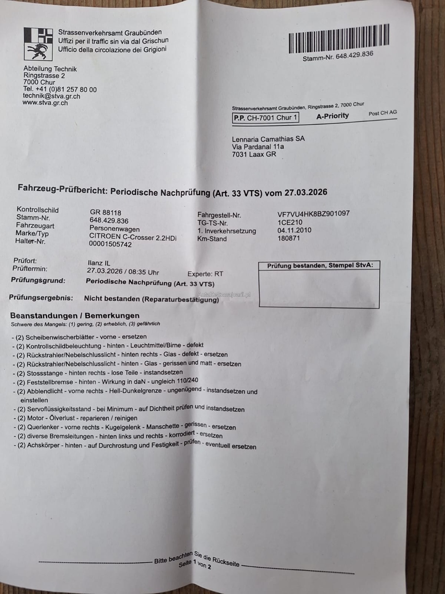 | Kommentar | Technische Mängel gem. Beilage. Fahrzeug wird bis am Dienstag noch tagtäglich gefahren. |
