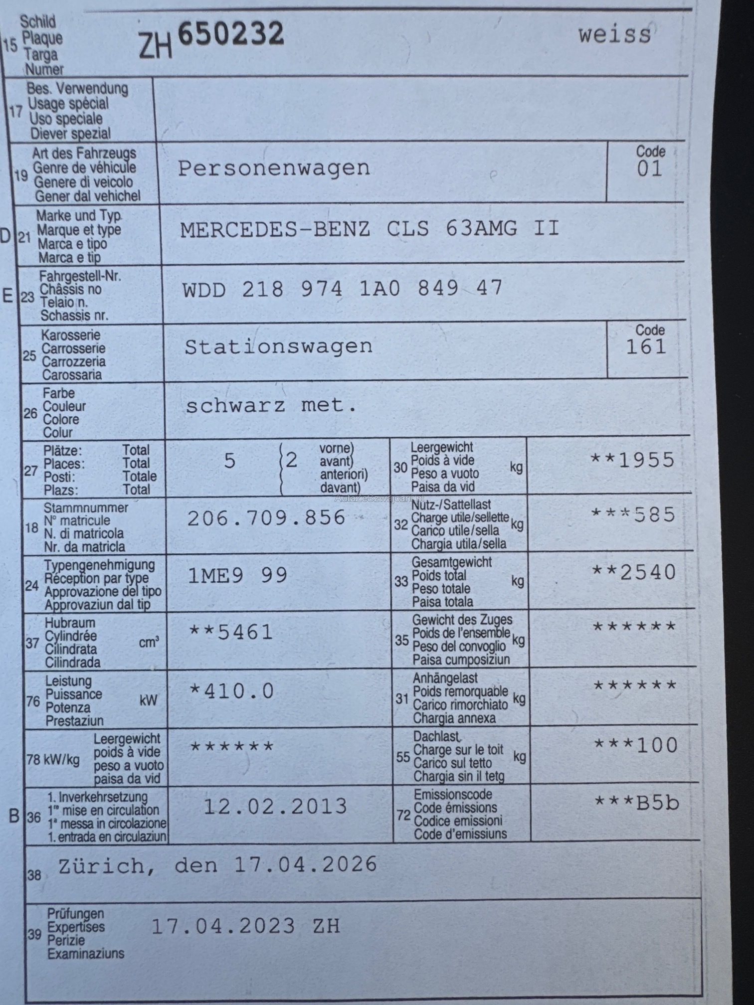 | Kommentar | Vollausgestatteter CLS 63 AMG SB mit Vollausstattung. Keramikbremsen, Bang & Olufsen BeoSound AMG, Alcantara Dachhimmel und vieles mehr.. in gutem Zustand. Wird frisch ab MFK geliefert. |
