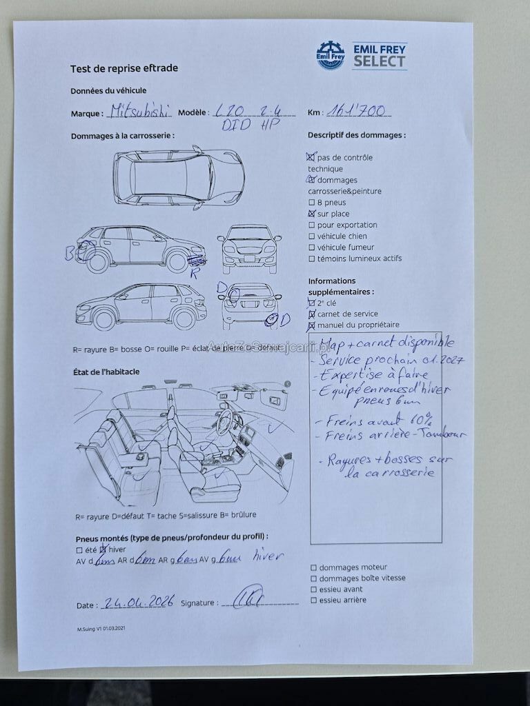 | Information | 2 clés Map + carnet de service disponible Service prochain 01.2027 Expertise à faire Equipé en roues d'hiver pneus 6 mm Freins avant 60% Freins arrière - Tambour Rayures et bosses sur la carrosserie Pas de contrôle technique (essai en route) effectué Pas de contrôle FAP / DPF |