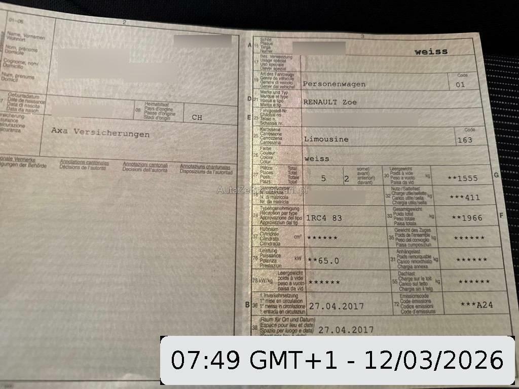 | Serienausstattung | 3-Punkt-Sicherheitsgurte auf allen Plätzen, 4 Lautsprecher, 4 Leichtmetallfelgen 16J mit Pneu, ABS, EBD elektronische Bremskraftverteilung, AUX-Anschluss, Airbag Beifahrer deaktivierbar, Airbag: Airbag Fahrer und Beifahrer, Akustisches Fussgänger-Warnsignal, Antriebsschlupfregelung (ASR), Aussenspiegel in schwarz, Aussenspiegel rechts und links beheizt, elektrisch verstell- / und einklappbar, Automatische Scheibenwischer vorne und automatisches Einschalten der Scheinwerfer (Show me Home), Batterie:der Fahrzeugpreis (Listenpreis) sich ohne Batterie ! Die monatliche Batteriemiete muss extra bezahlt werden., Berganfahrhilfe, Bluetooth Freisprecheinrichtung, Bordcomputer, Colorverglasung, Elektrische Fensterheber vorne + hinten, Elektronisches Stabilitäts-Programm (ESP), Gurtstraffer mit Gurtkraftbegrenzer, Höhenverstellbare Gurten vorne, ISOFIX-Kindersitzverankerungen hinten (2), Innenharmonie weiss, Keyless Drive Hands-free, Klimatisierungsautomatik, Ladekabel, Lenkrad längs- und höhenverstellbar, Lenkrad und Schalthebelgriff in Leder, Licht: LED-Tagfahrlicht, Make up-Spiegel links, Make up-Spiegel rechts, Navigationssystem Tom Tom, Notbremsassistent, Park Distance Control hinten, Radio, Radiofernbedienung mit Satellit, Regensensor für Scheibenwischer vorne, Renault R-Link Evolution, Räder: Reifendruckkontrollsystem, Räder: Reifenreparatur-Set (Tire Fit), Seitenairbag für Fahrer und Beifahrer, Servolenkung, Sitze: Kopfstützen hinten höhenverstellbar, Sonnenblende links, Sonnenblende rechts, Stoff-Ausstattung, Stufenloser Automat, Tempomat mit Geschwindigkeitsbegrenzer, Türgriffe aussen in Wagenfarbe, USB-Anschluss, Untersteuerungskontrolle (CSV), Warnblinkautomatik bei Vollbremsung, Wegfahrsperre elektronisch, Wärmepumpe, Zentralverriegelung mit Fernbedienung und automatischer Türverriegelung |